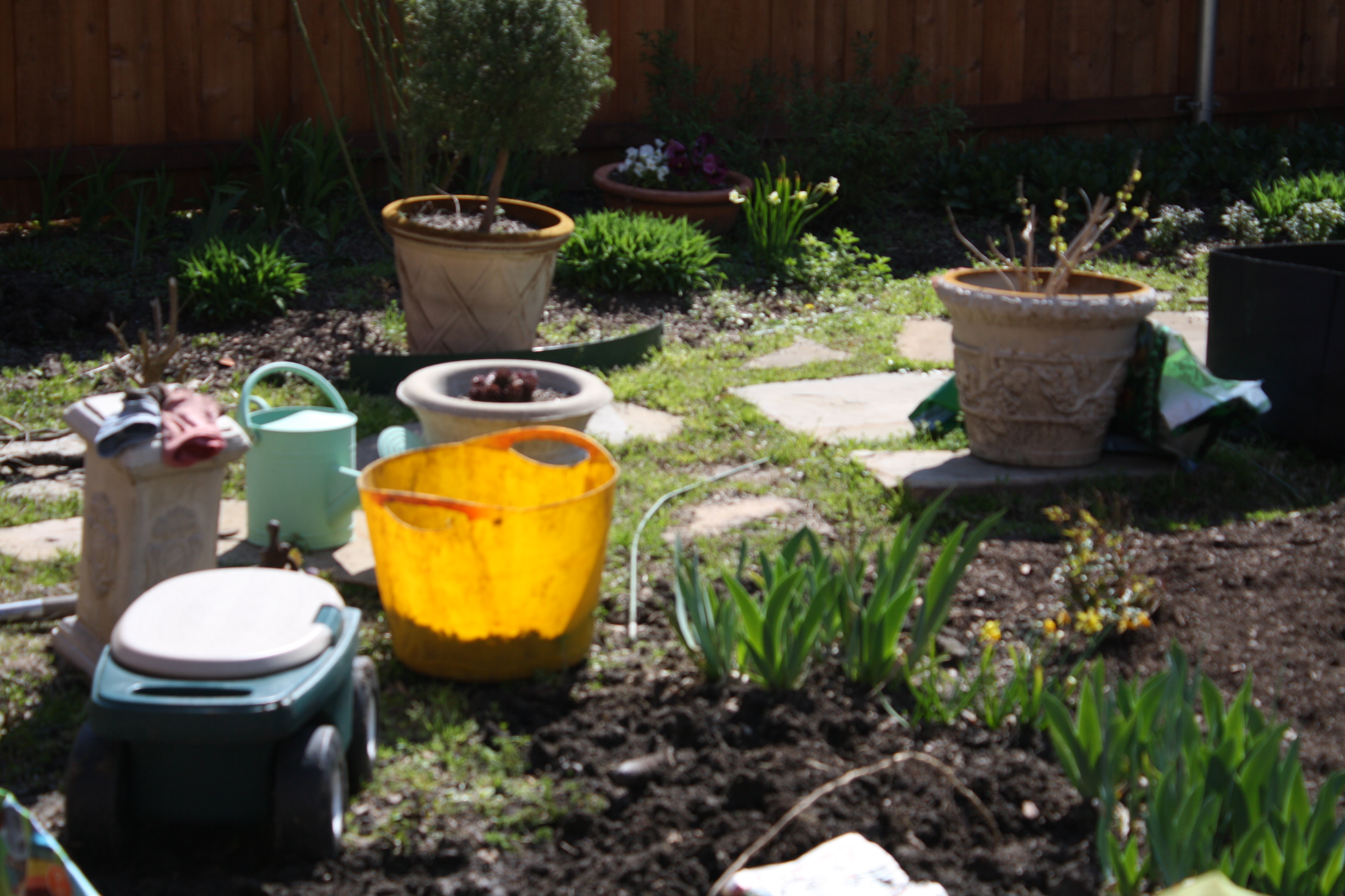 I’m not sure but on the 18th , I took off from my day job to work in the garden. It was an absolutely gorgeous day. 70’s. I made several trips to the nursery for compost/bedding mix etc. to raise my beds. I have this “island” in the middle of the garden which seemed to have sunk over the winter. As a matter of fact, I believe all my beds have. So, I added edging all around the bed. I then began the laborious task of weeding. After weeding, I placed newspaper down on the ground and added my bedding mix/compost on top. I am hoping this will deter the weeds. I know mulch is also used to deter weeds, but I have found with our humidity mulch is a haven for pill bugs and snails. It may be I just haven’t found the “right” mulch.
