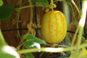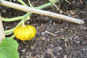 My pumpkin vines are growing with itty bitty pumpkins forming. How cute is that?